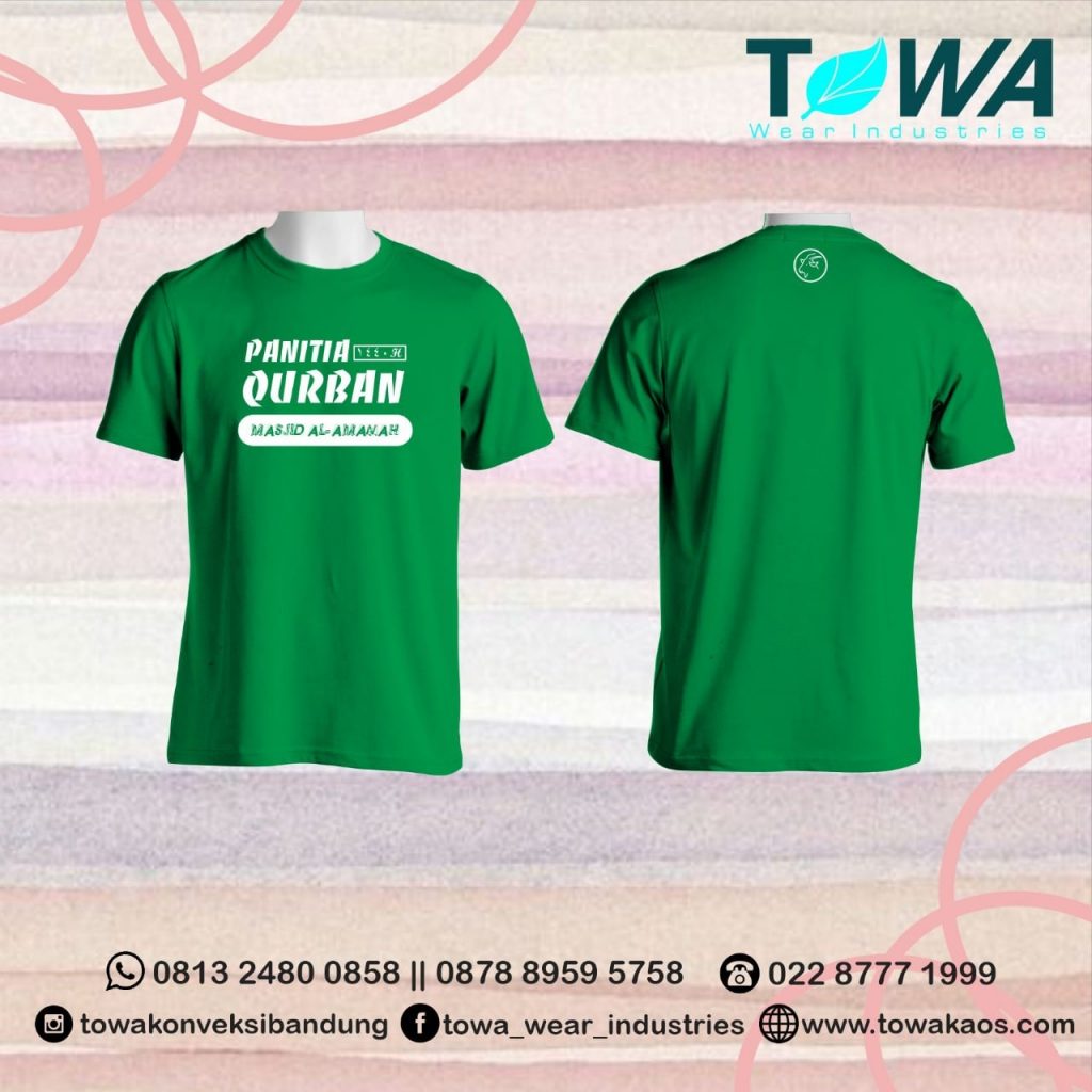 Desain kaos panitia qurban bisa seperti ada tambahan sablon berupa identitas nama masjid dan tulisan panitia.
