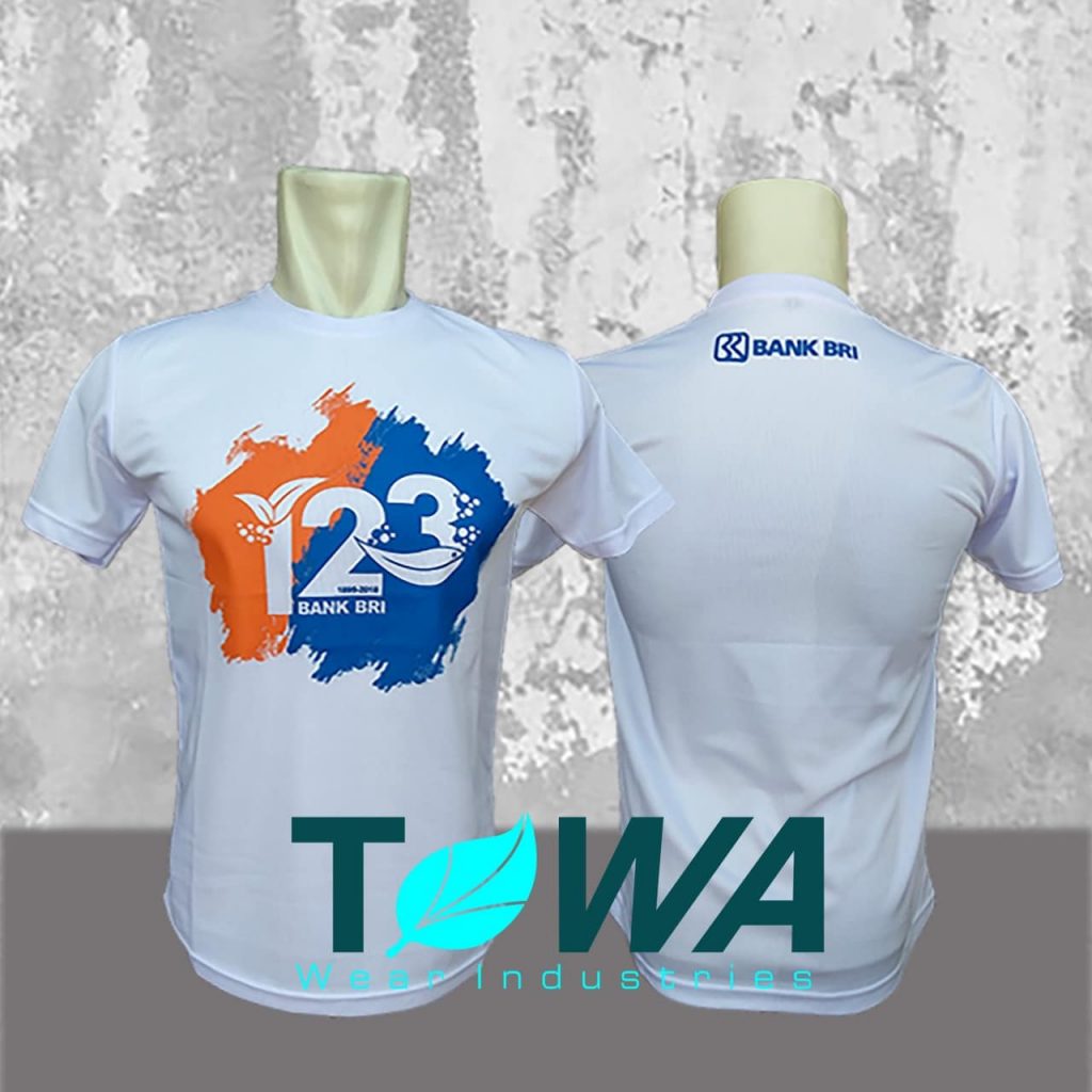 Baju kaos memang cocok dipakai untuk kegiatan event yang mengharuskan di luar ruangan dan memerlukan gerak banyak. Bahan kain yang umum di pakai untuk baju kaos ulang tahun Bank BRI yaitu bahan cotton combed yang mempunyai daya serap keringat sangat bagus dan adem sehingga tidak akan membuat kulit iritasi. Namun ada pula yang menggunakan baju kaos dengan bahan drifit yaitu jenis bahan kain yang biasa di pakai uuntuk jersey sehingga cocok untuk kegiatan yang memerlukan banyak gerak. Sedangkan untuk design gambarnya setiap tahunnya berbeda karena di sesuaikan dengan tema acara.